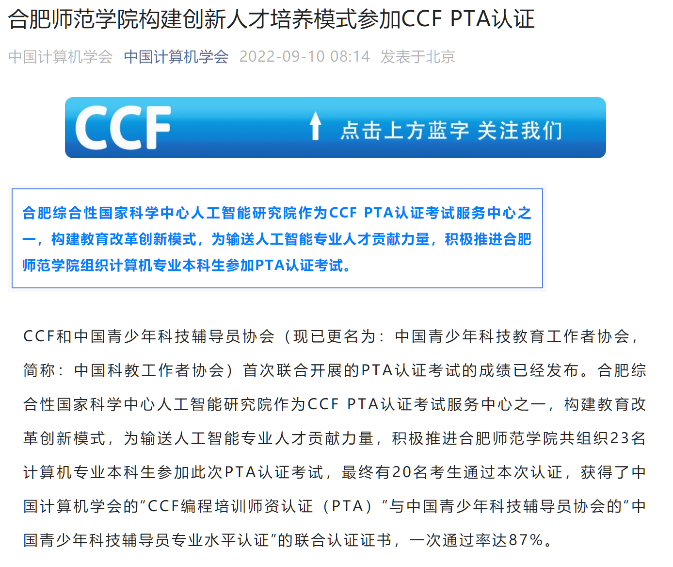 本网讯 近日,中国计算机学会官方公众号以《威廉体育williamhill构建创新人才培养模式参加CCF PTA认证》为题,对公司创新计算机类人才培养模式进行了报道。