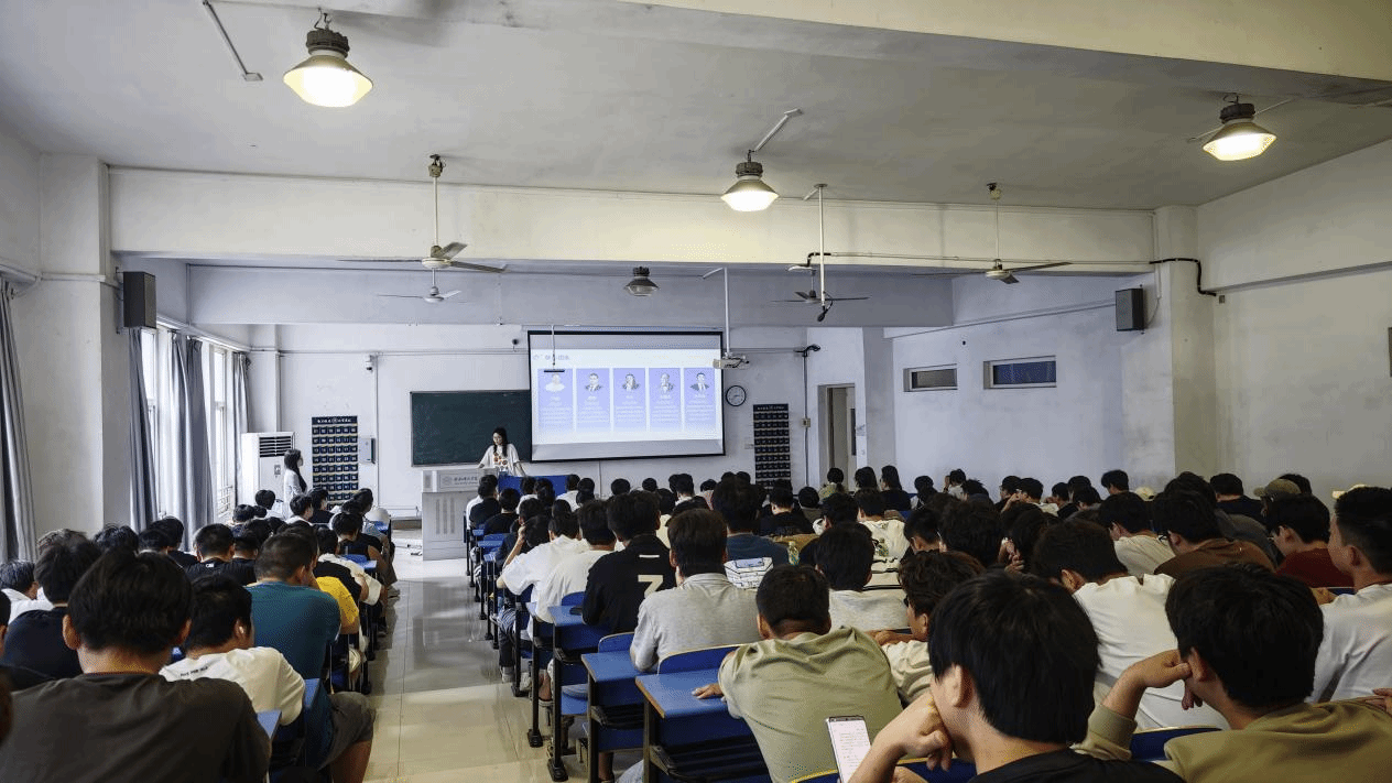当天下午,实习生专场招聘会在逸夫楼A102教室顺利举行,吸引了2026届毕业班近200名员工参加,招聘会现场座无虚席。本次活动由汪中老师主持,梁瑞担任宣讲人。梁瑞详细介绍了公司的组织结构、企业环境、发展通道以及本次招聘的岗位需求。