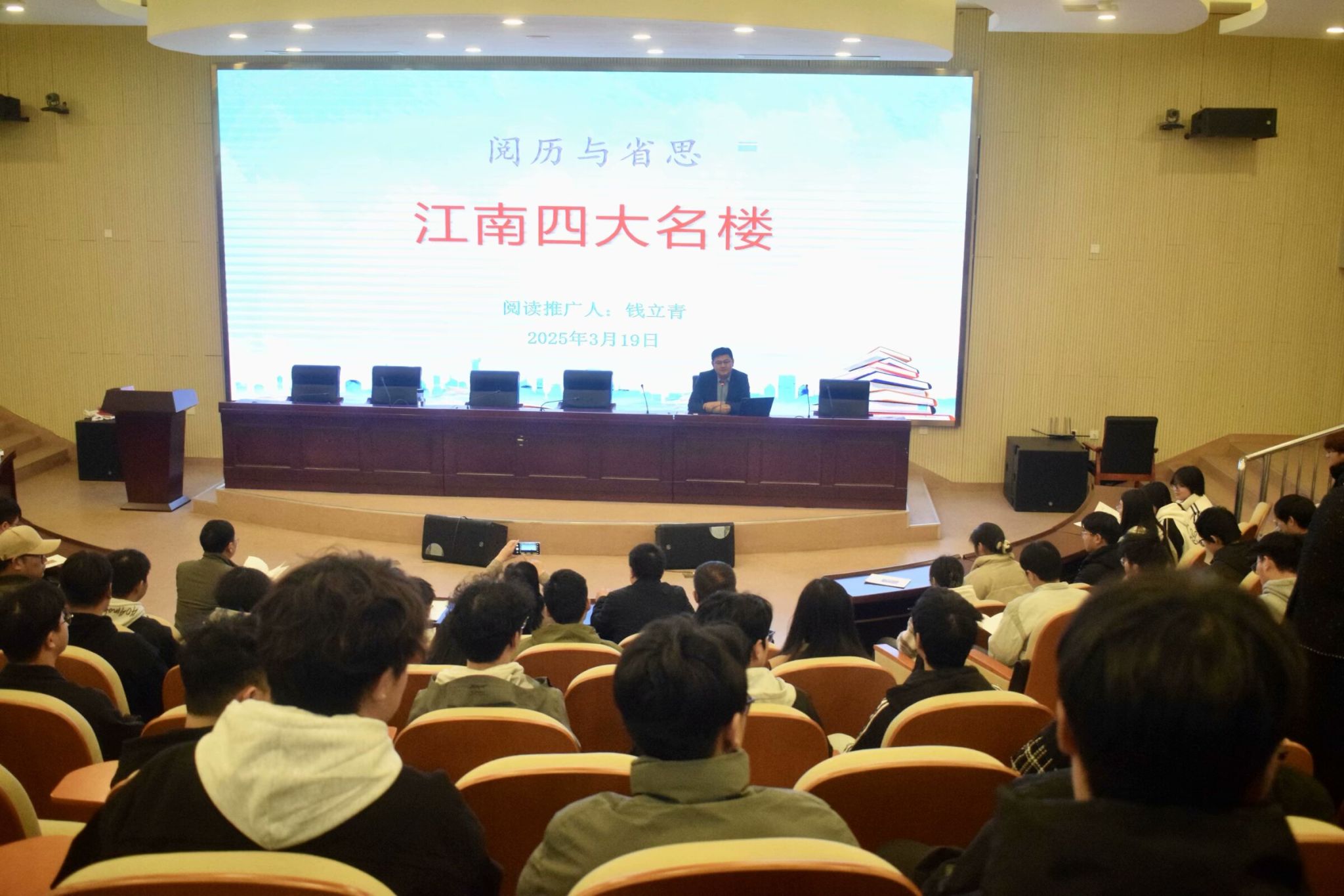 3月19日,“阅+历”读书讲堂“名家导读”系列讲座在滨湖校区多功能报告厅举办,江淮文化名家、安徽省十佳阅读推广人,教务处处长钱立青教授为同学们作了题为“阅历与省思:江南四大名楼”的讲座。威廉体育williamhill员工代表150余人参加。滨湖校区综合管理办公室主任周荣,图书馆馆长方孝玲,美术与设计公司副经理吴道义,公司党委副书记杨萍出席。讲座由公司党委书记王祥主持。