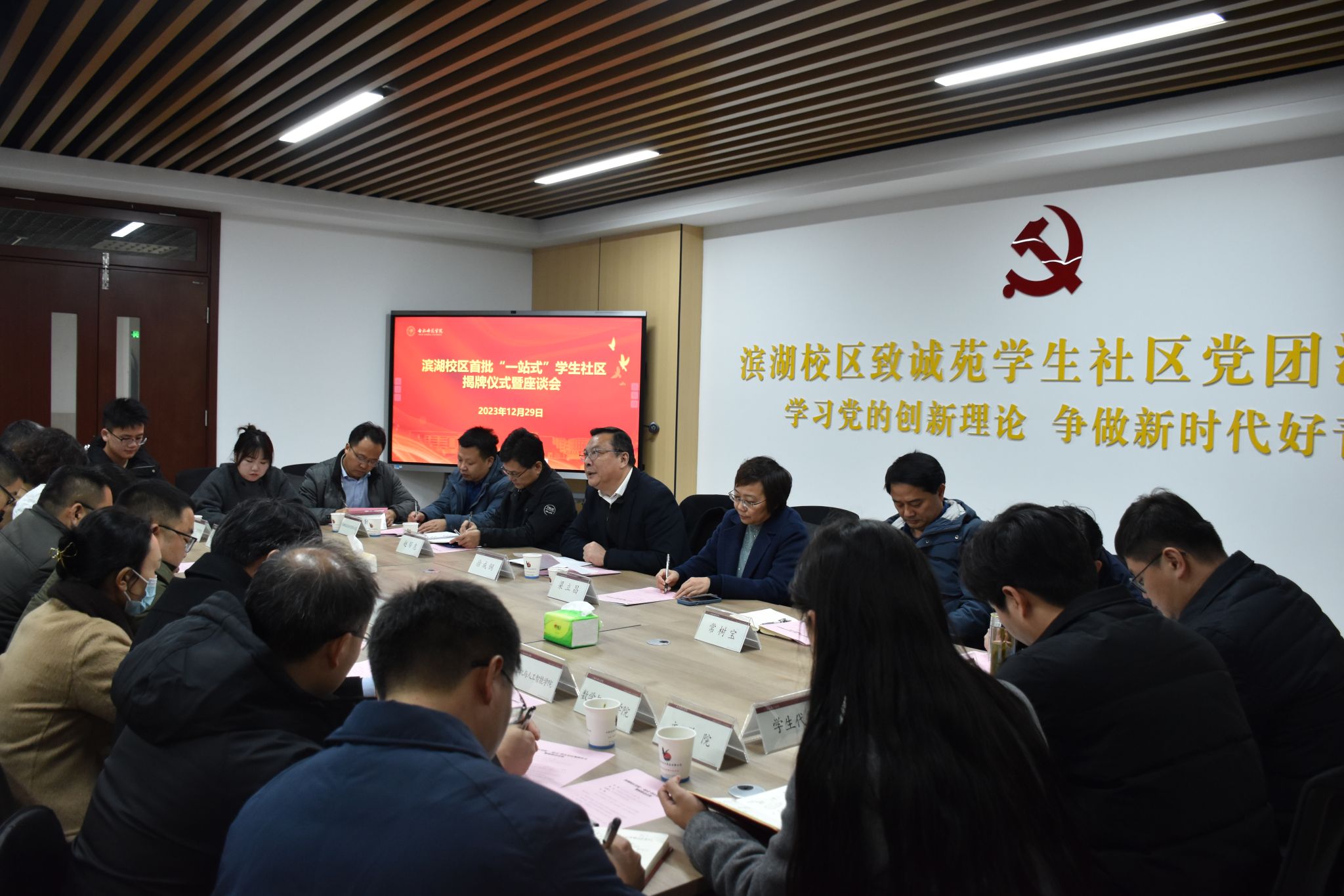 本网讯 2023年12月29日上午,公司滨湖校区首批“一站式”员工社区揭牌仪式暨座谈会在滨湖校区1号员工公寓“一站式”员工社区举行。公司党委书记徐成钢,公司党委副书记梁立昌,公司党委委员、组织部部长赵帮恚,公司党委委员、宣传部部长常树宝出席会议并为滨湖校区首批“一站式”员工社区揭牌。教务处、后勤处、滨湖校区综合管理办公室、员工工作部、团委等单位负责人,各二级公司有关负责人、辅导员和员工代表参加会议。会议由梁立昌主持。